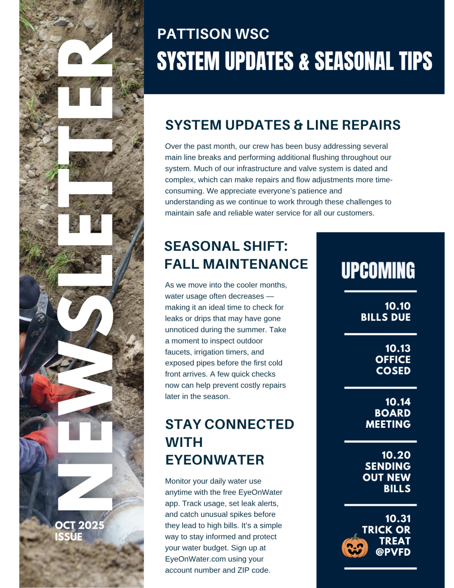 At Pattison Water Supply Corporation, we are committed to providing safe, high quality water services to our community, while maintaining a standard of excellence in customer service and environmental conservation.