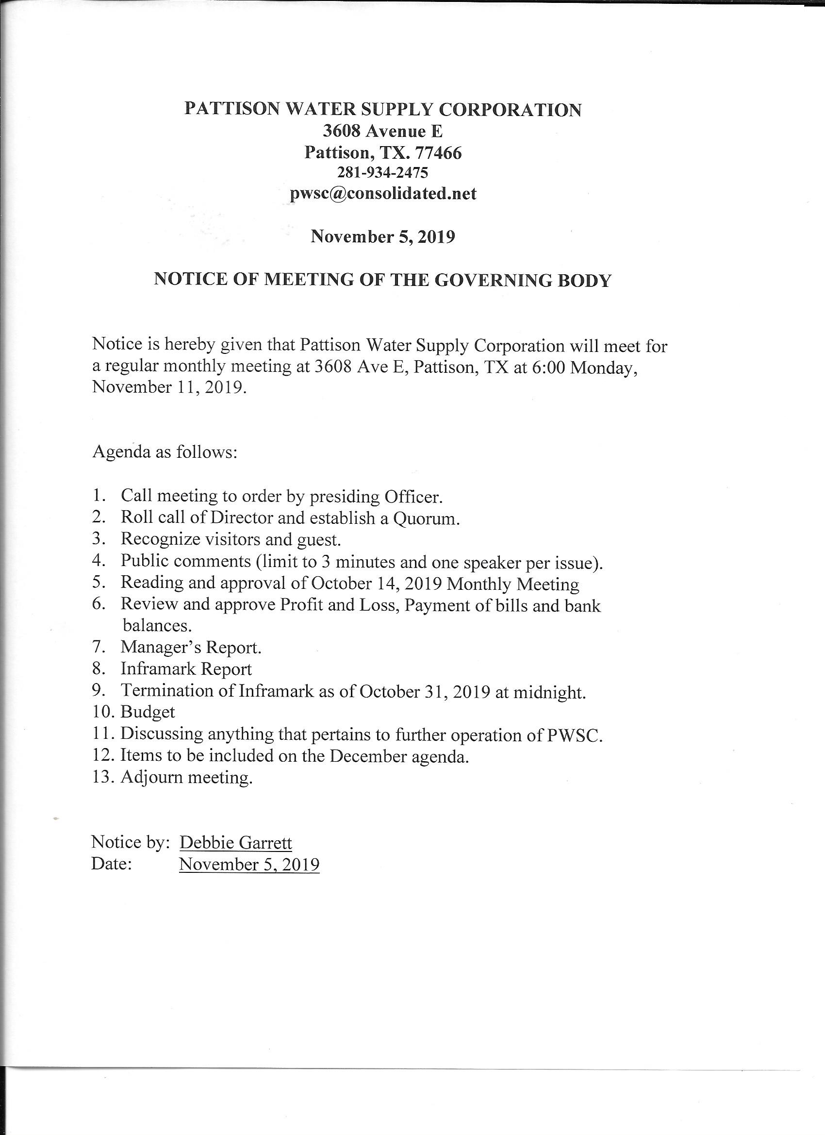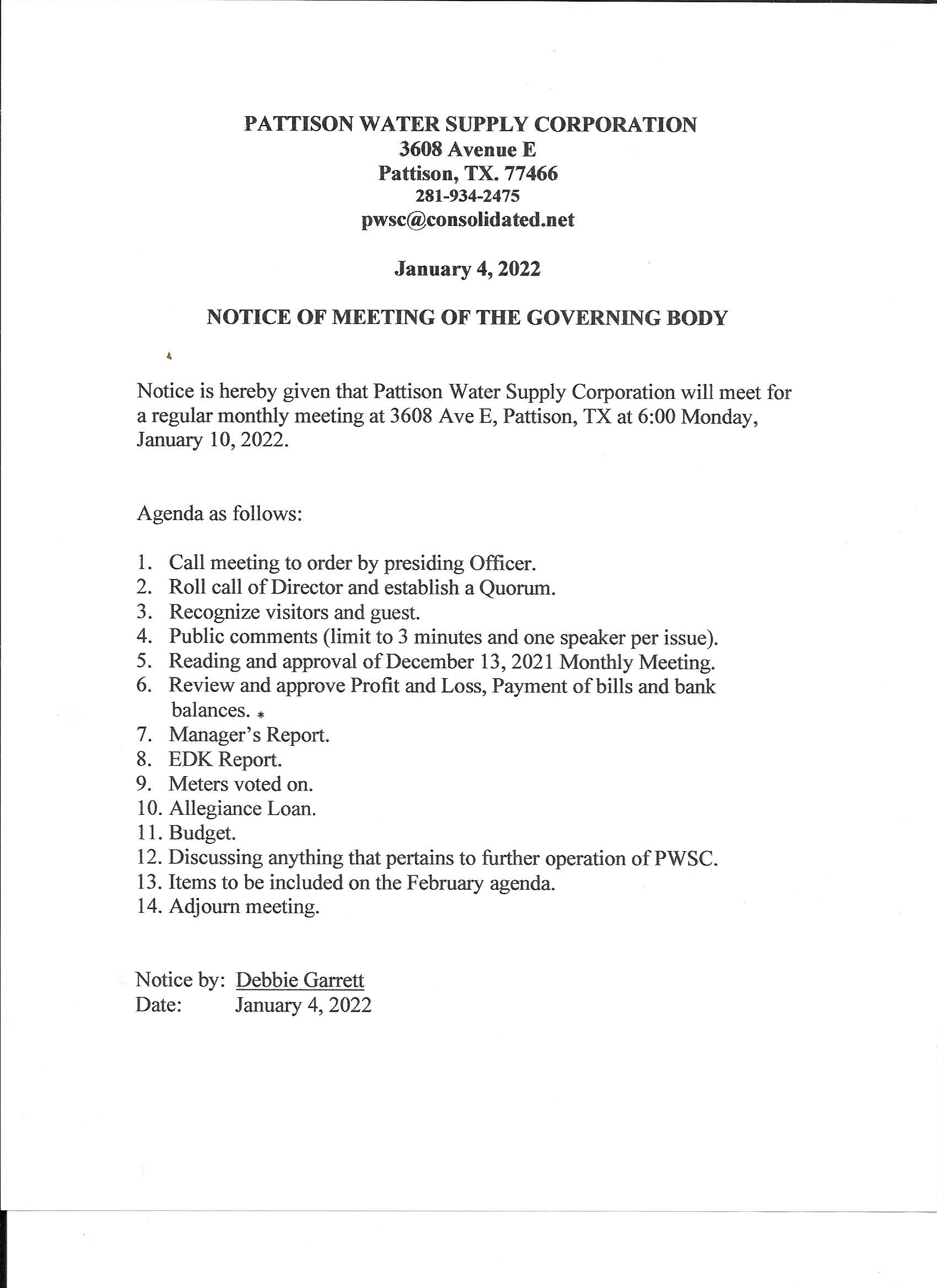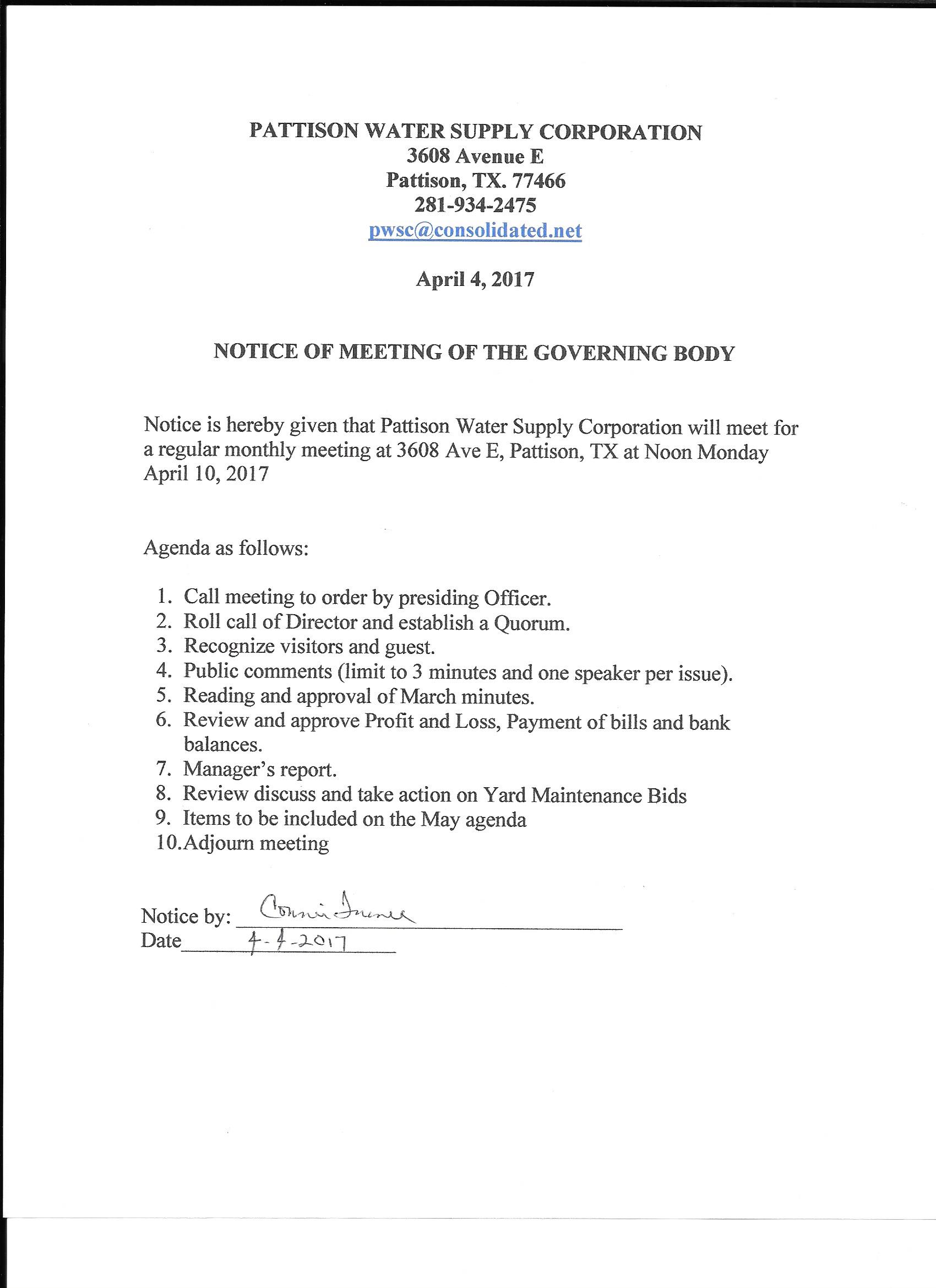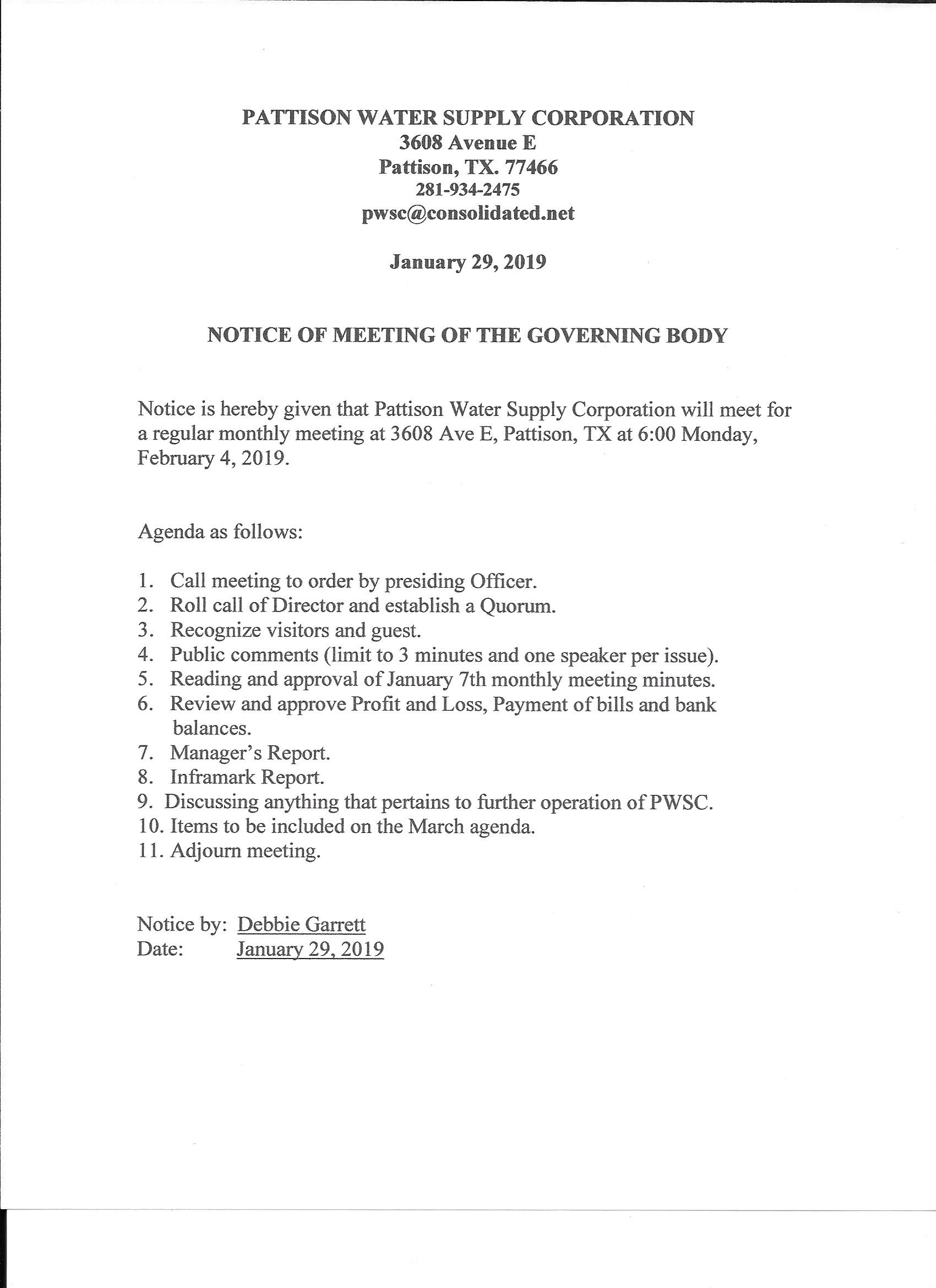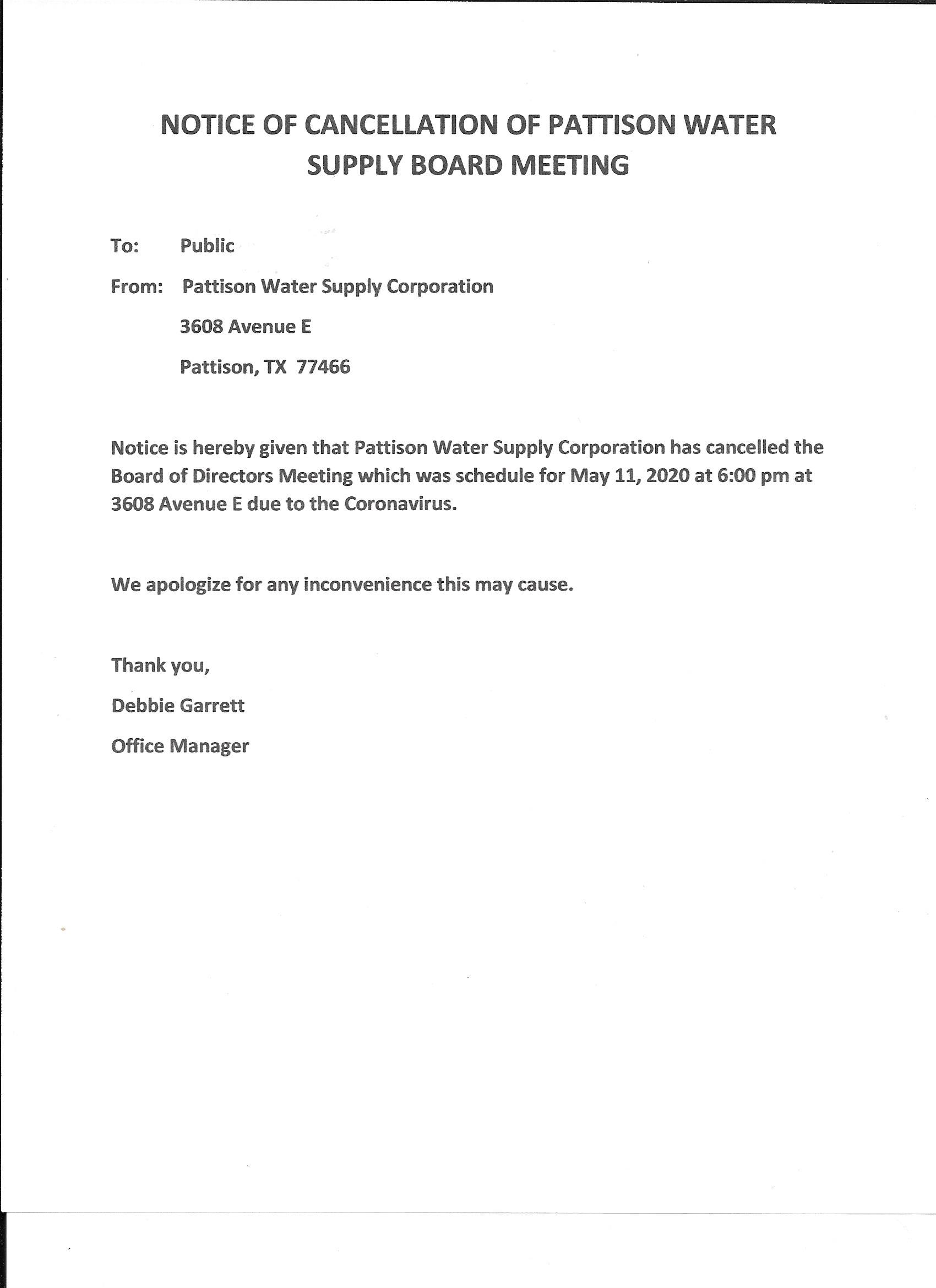 Welcome to the Pattison Water Supply Corporation Archived Board Meetings Page.